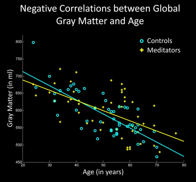 Berdasarkan hal ini Eileen dan kawan kawan melakukan penelitian bagaimana cara untuk meminimalisir penipisan Gray Matter di otak. Dalam penelitiannya Eileen mendapatkan hasil bahwa peserta meditasi mengalami perlambatan penurunan fungsi otak yang dilihat dari penurunan volume Gray Matter yang sangat lambat seperti terlihat dalam gambar di bawah ini.