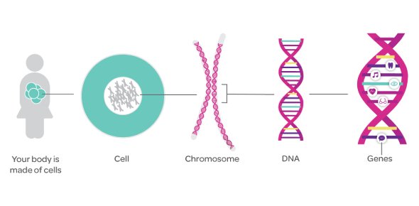 Ilustrasi pertama menggambarkan tentang tubuh manusia yang terdiri dari triliunan sel. Dalam setiap sel terdapat kromosom yang tersusun dari DNA, dan dalam DNA inilah terkandung gen.