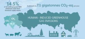 Salah satu faktor yang mempercepat pemanasan global adalah emisi gas yang dikeluarkan oleh peternakan. Emisi gas yang dikeluarkan oleh peternakan adalah setara yang mencapai 7.1 gigaton CO2 per tahun. Dalam salah satu presentasinya, FAO menyarankan untuk mengurangi pola konsumsi daging sehingga bisa mengurangi emisi gas.